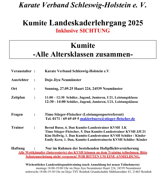 KVSH Kumite Landeskadertraining 2025 inklusive Sichtung in Neumünster am Samstag 27.09.2025