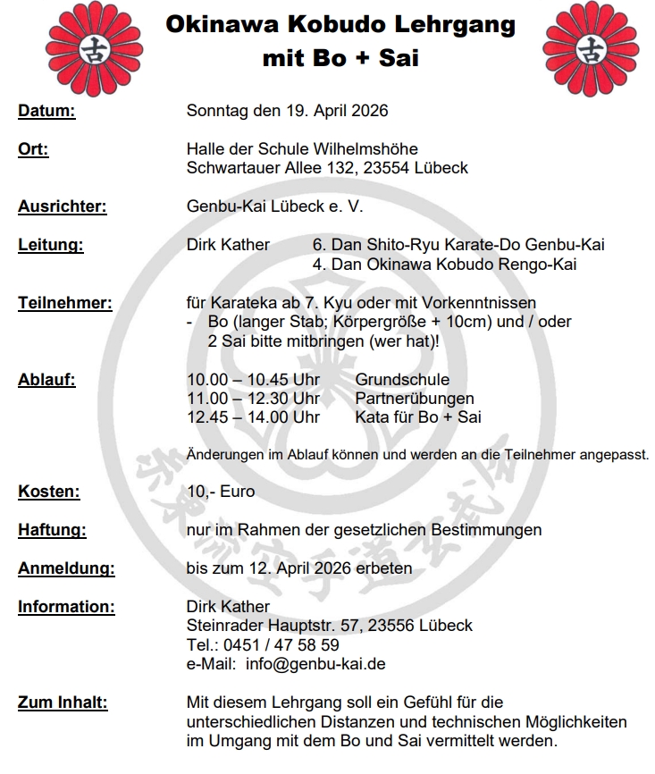 Veranstalter Hamburger Turnerschaft von 1816 Abteilung Karate hier geht's zur Ausschreibung: Lehrgang