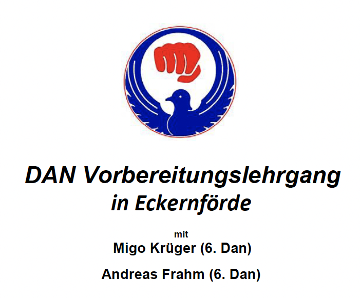 DAN Vorbereitungslehrgang in Eckernförde mit Migo Krüger (6. Dan) Andreas Frahm (6. Dan) Datum: 25.04.2026 Ort: Gudewerdt Sporthalle, Johann-Hinrich-Fehrs-Weg, 24340...
