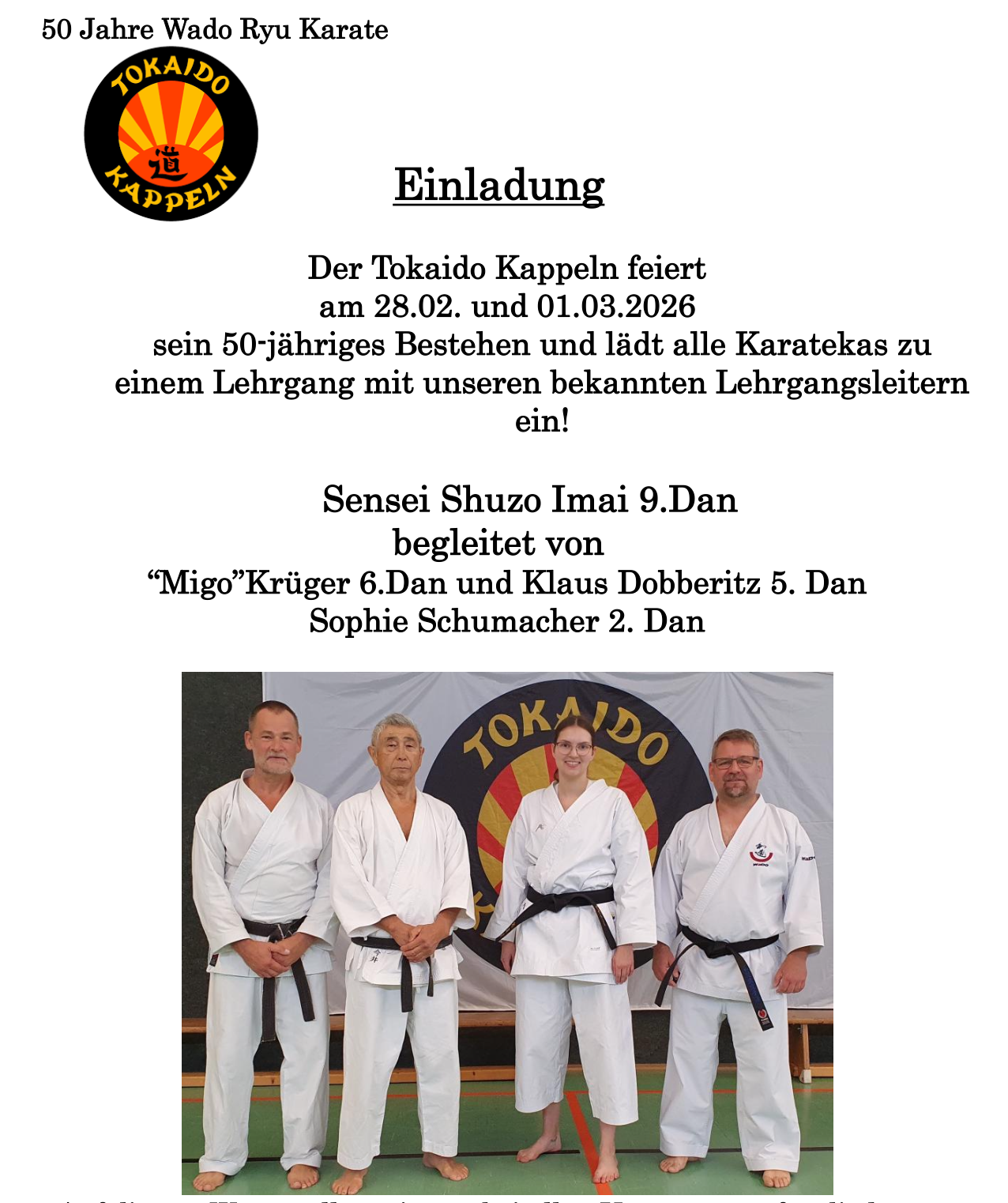 Kappeln Hindenburgstr., Kappeln, SH, GermanyDer Tokaido Kappeln feiert sein 50-jähriges Bestehen und lädt alle Karatekas zu einem Lehrgang mit bekannten Lehrgangsleitern ein! Sensei Shuzo...