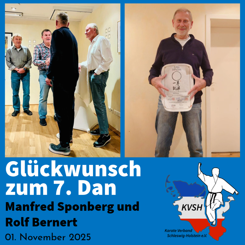 Vor einem hochkarätigen Prüfergremium bestehend aus DKV-Ehrenpräsident Roland Hantzsche, KVSH-Ehrenpräsident Wolfgang Hagge sowie KVN-Präsident Dr. Dierk Hickmann zeigten die beiden Karateka eine beeindruckende Leistung, die am Ende mit dem 7. Dan belohnt wurde.