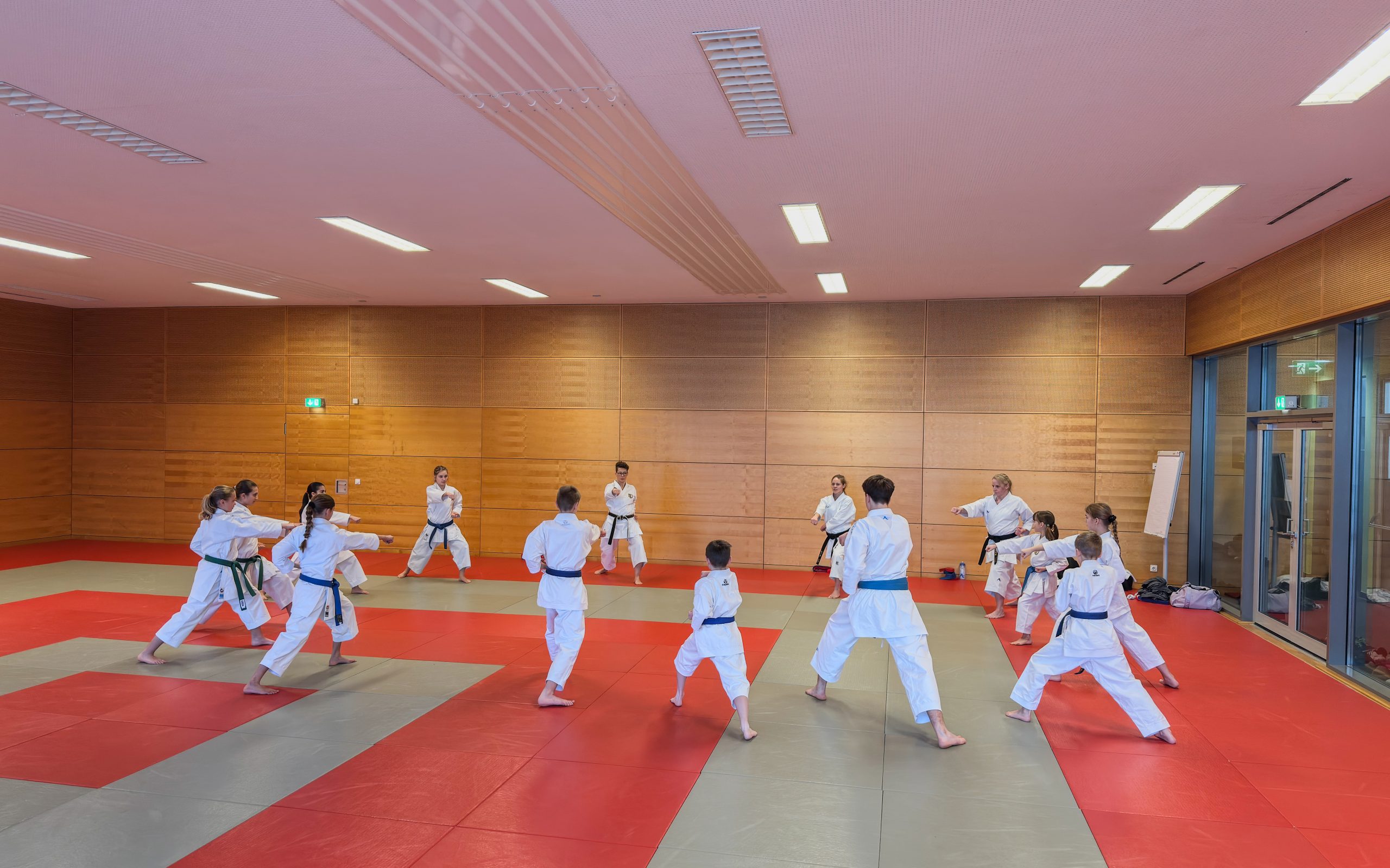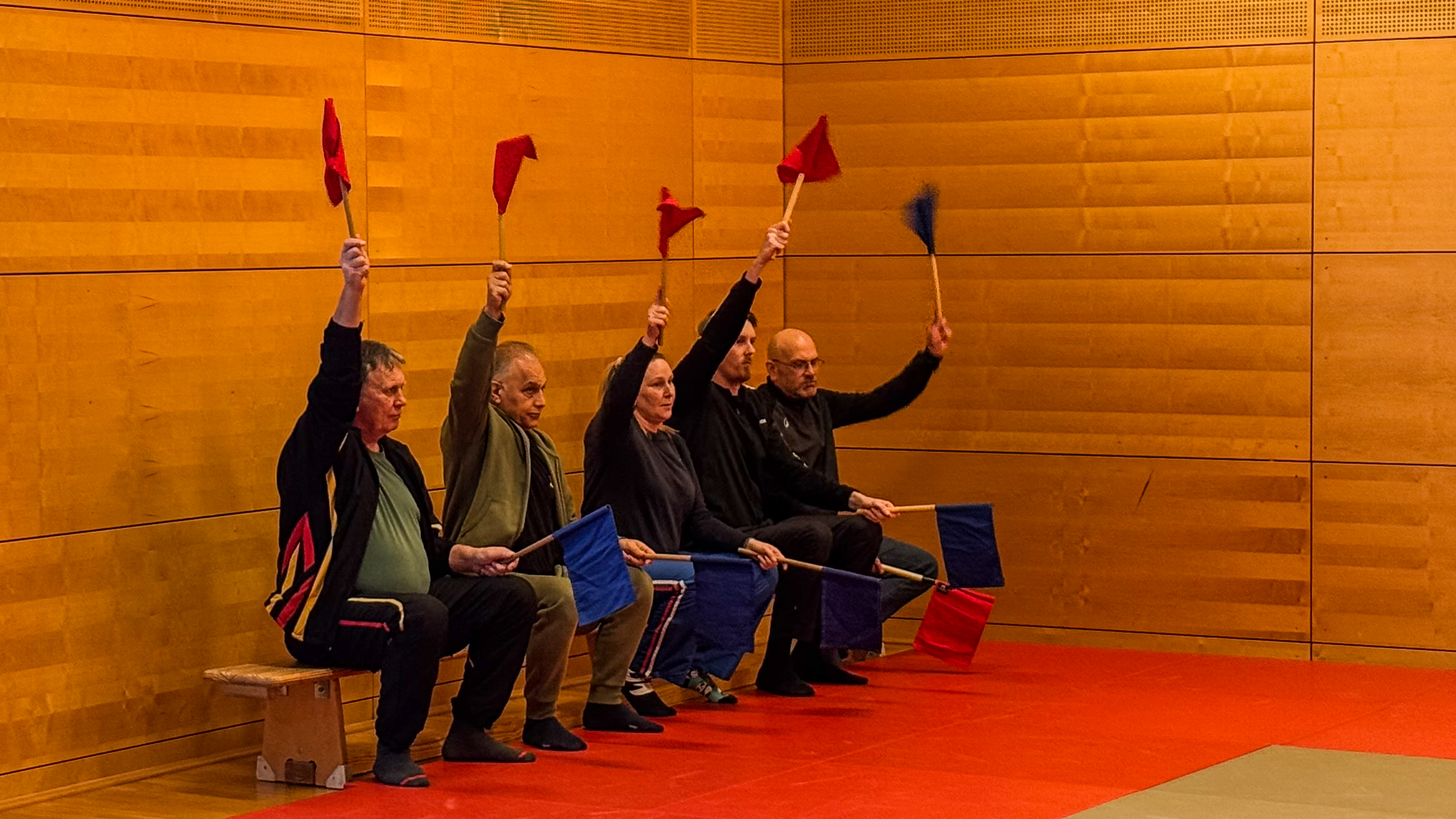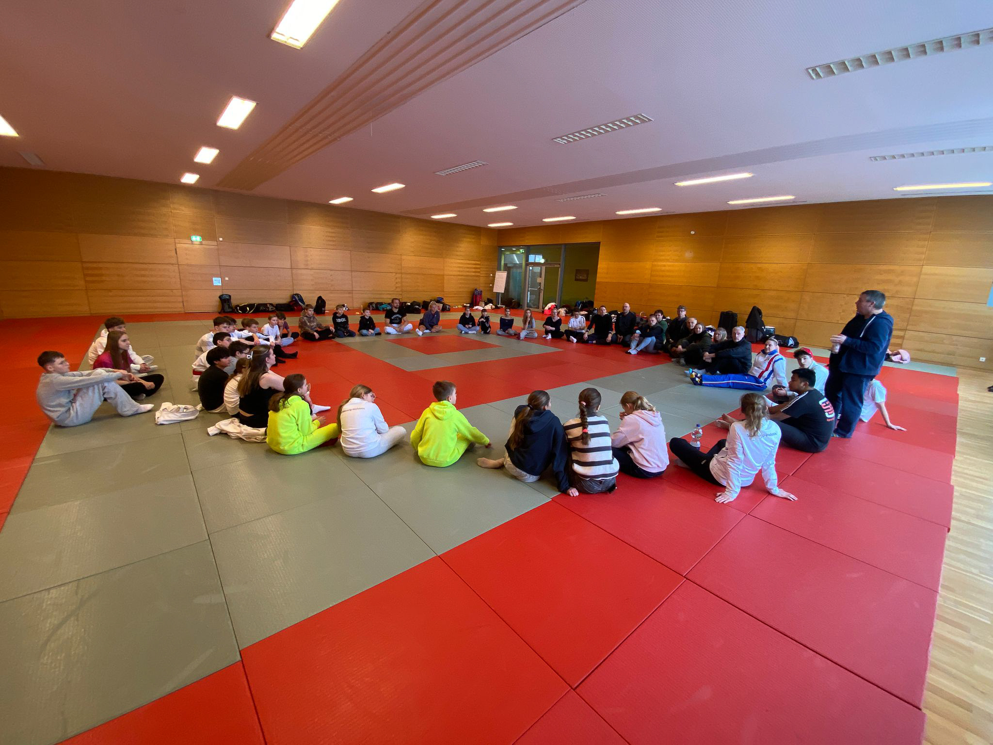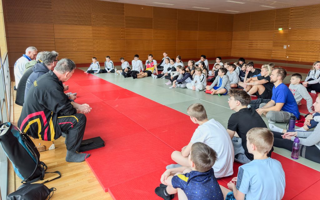 Gemeinsam mit Emily durfte ich die Kumitesportler in den großen Raum mit den Judomatten führen. Besonders war dabei, dass alle Altersklassen gemeinsam starteten: von U10 bis zur Masterclass. Eine bewusste Entscheidung. Denn genau hier beginnt Teamgeist: wenn Jung und Alt gemeinsam schwitzen, lernen und sich gegenseitig antreiben.