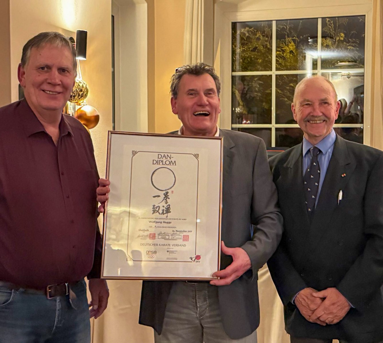 Ein besonderes Highlight des Abends war die offizielle Urkundenvergabe an Wolfgang Hagge, der auf der Bundesversammlung des Deutschen Karate Verbandes im November 2025 mit dem 9. Dan ausgezeichnet wurde – der höchsten Graduierung, die ein Karateka in Deutschland erreichen kann. Die Urkunde wurde ihm im Rahmen der Abendveranstaltung im Restaurant L.O.K.S. in Neumünster durch Rolf Lahme (Präsident des KVSH) und Karl-Peter Ludwig (Gründungspräsident des DKV) überreicht.
